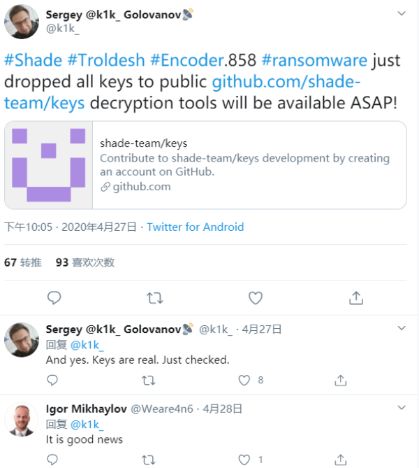 但事情還沒有結束,更吊詭的事情發(fā)生了,制造Troldesh病毒的黑客團隊在Github上發(fā)表了聲明,宣布要金盆洗手,病毒已經(jīng)在2019年停止傳播了。他們決定再做最后一件事——公布團隊擁有的所有解密密鑰,總計超過75萬個。