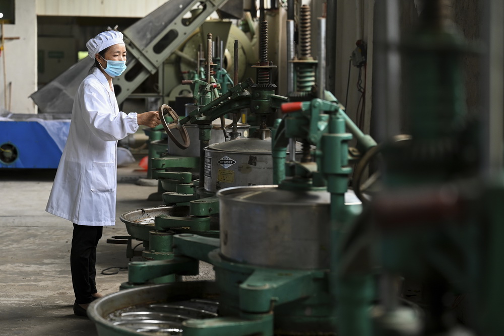 楊秀貴用機(jī)器揉捻茶葉。