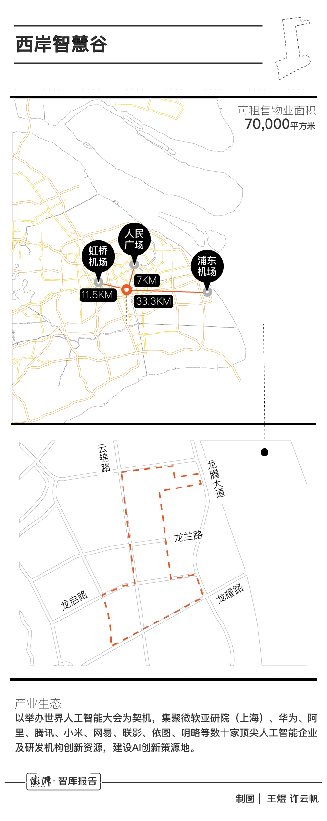 與其他特色園區(qū)不同,西岸智慧谷的產(chǎn)業(yè)主要集聚在樓宇內(nèi),包括世界人工智能大會(huì)場(chǎng)館群落在內(nèi),雖然只有0.52平方公里,但建筑面積120萬平方米,樓宇產(chǎn)值高。