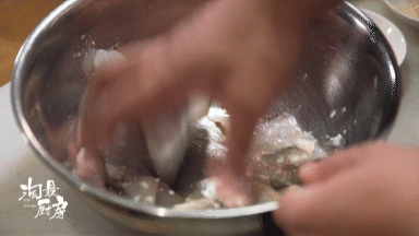 加0.5個蛋清、1茶匙鹽、3茶匙生粉,攪拌均勻。