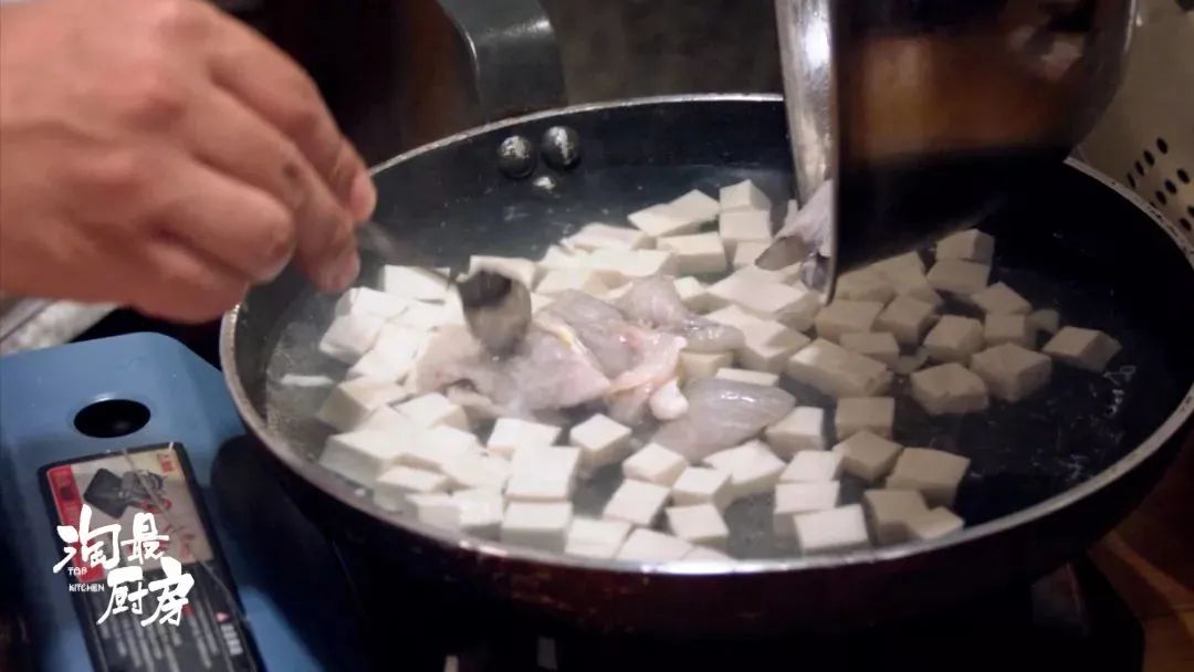 鍋內放水,燒開后放2茶匙鹽,下豆腐和魚片,