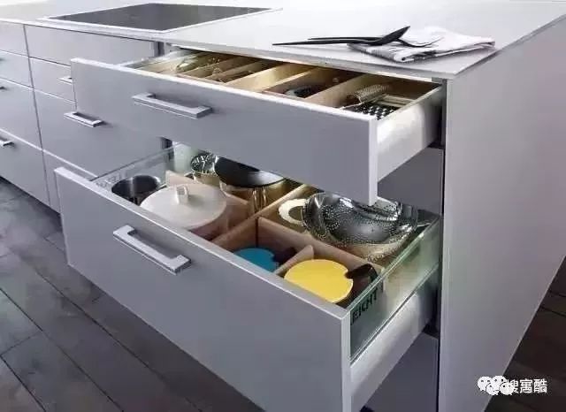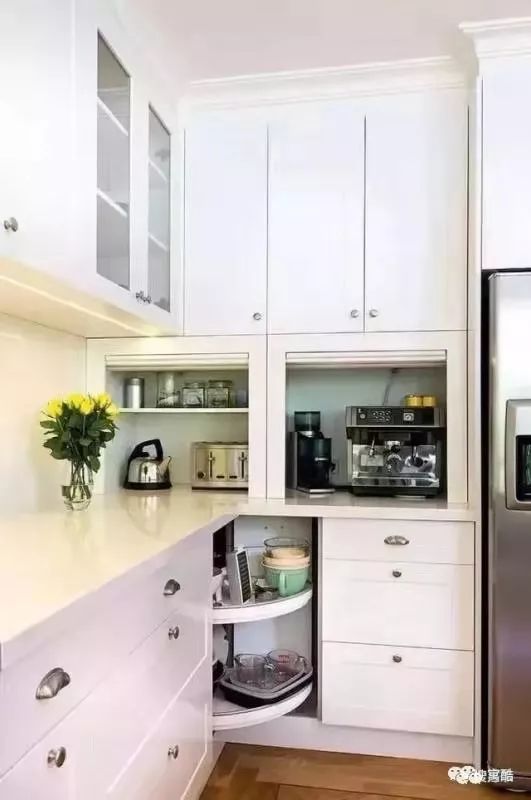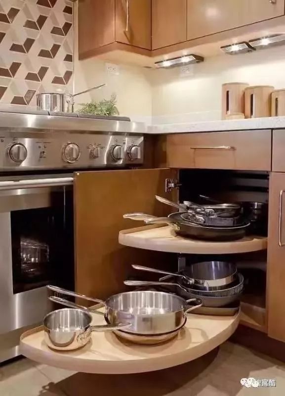 4、島臺(tái)可提高備餐的速度,使烹飪更有樂趣。收拾完明面上的雜亂,該收拾隱藏在里面的雜亂了。廚房中最常見的三種轉(zhuǎn)角柜:轉(zhuǎn)籃、飛碟、小怪物。如下圖: