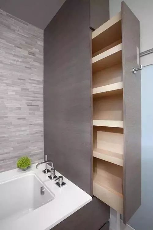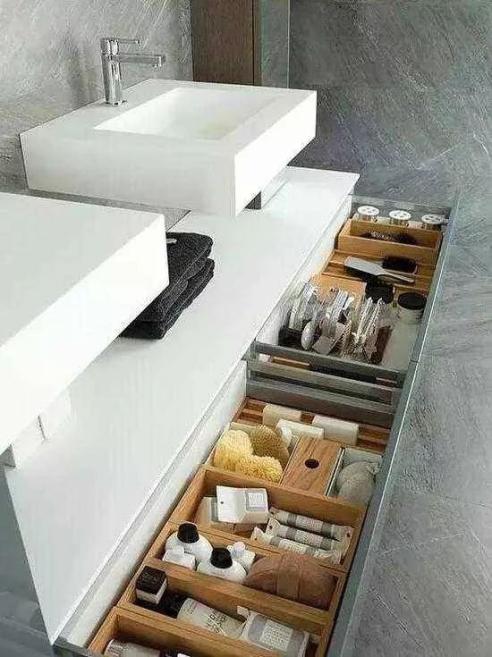 設(shè)置內(nèi)嵌式的置物架,擺放洗漱用品等。以及抽屜式收納等,如圖:
