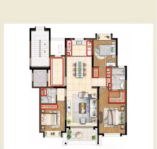 同時(shí),在標(biāo)紅的區(qū)域也可以看出,好的戶型收納,是在各個(gè)區(qū)域都有專屬的收納空間,講究各處均布的方式。