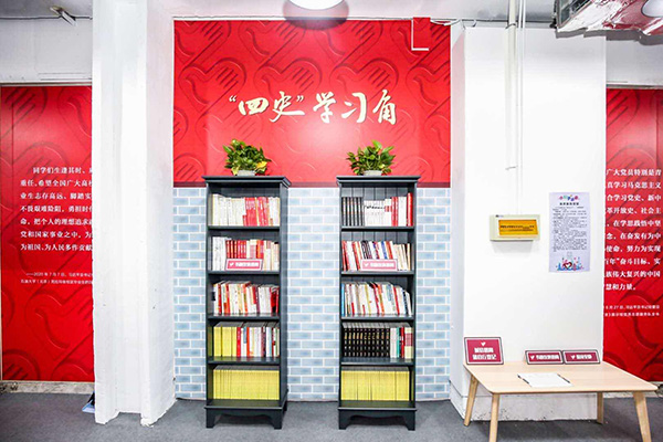 來(lái)到“四史”學(xué)習(xí)角,書(shū)架上已擺放了200多本“四史”方面的書(shū)籍供借閱,志愿者還可撰寫(xiě)“四史”讀書(shū)筆記,參與“我在進(jìn)博學(xué)‘四史’”三行詩(shī)征集活動(dòng)等。