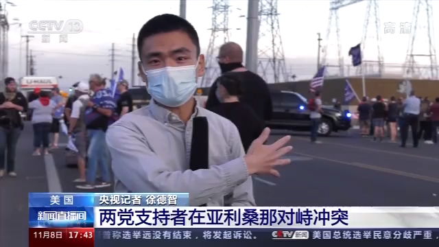 央視記者徐德智:大家可以看到在我的身后,現(xiàn)在仍然有很多特朗普的支持者在這里表達(dá)他們對于此次選舉計票的不滿。就在這些支持者旁邊街道不遠(yuǎn)的地方,我們還可以看到有拜登的支持者。一度他們是產(chǎn)生了對峙。 道路一側(cè)是拜登支持者,稱選舉公平,另一側(cè)是特朗普支持者,說選舉舞弊。雙方手持標(biāo)語和旗幟相互喊話,甚至有特朗普支持者到支持拜登人群中,面對面挑釁,雙方劍拔弩張。